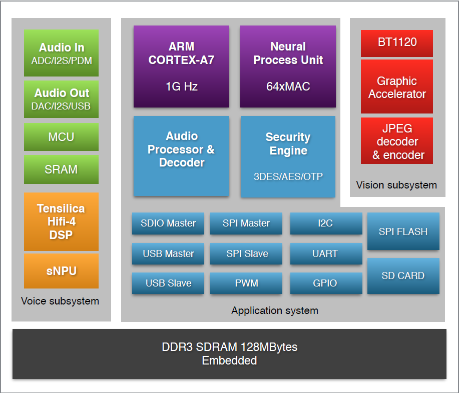 - Use heterogeneous SOC architecture which contains one MCU and one Cortex-A7; This architecture is designed for low power voice wakeup realization;